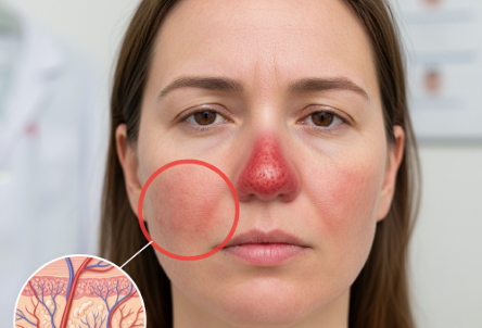 주사피부염은 주로 코와 뺨 등 얼굴 중앙 부위에 홍조, 혈관 확장, 염증성 뾰루지 등이 지속적으로 나타나는 만성 질환입니다. 아직 명확한 원인은 밝혀지지 않았지만, 유전적 요인, 혈관 기능 이상, 피부 장벽 손상, 모낭충의 증가 등이 복합적으로 작용하는 것으로 알려져 있습니다.