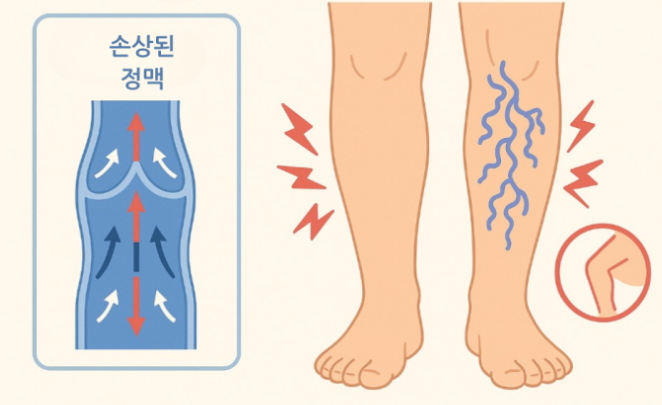 하지정맥류는 이 판막이 유전적인 요인이나 노화, 생활 습관 등으로 인해 손상되거나 기능이 약해져 발생합니다. 문이 고장 나 제대로 닫히지 못하면, 위로 올라가야 할 혈액이 다시 아래로 역류하면서 다리 정맥에 고이게 됩니다. 이 고인 혈액의 압력으로 인해 혈관이 부풀어 오르고, 뱀처럼 구불구불하게 튀어나오게 되는 것이죠.
